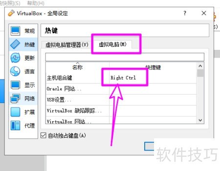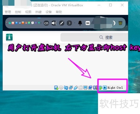 2、 当用户在VirtualBox中运行任意虚拟机时,界面所示位置即为当前设定的主机键。若鼠标已切换至虚拟机内,只需按下此热键即可快速返回物理主机系统,实现主控端与虚拟环境间的便捷切换。