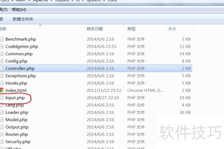 2、 进入CI框架目录,定位并打开system/core/文件夹中的Input.php文件。