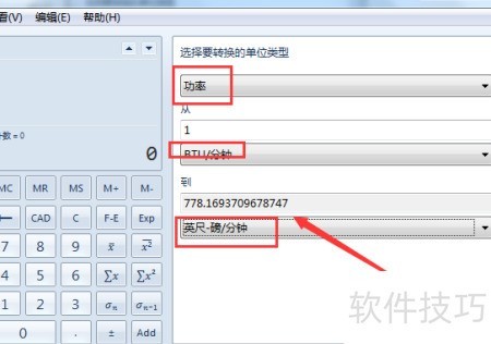 3、 在单位转换中选择功率,设定目标单位为英尺每分钟,输入1 BUT/分钟,转换结果约为778.1693英尺每分钟。