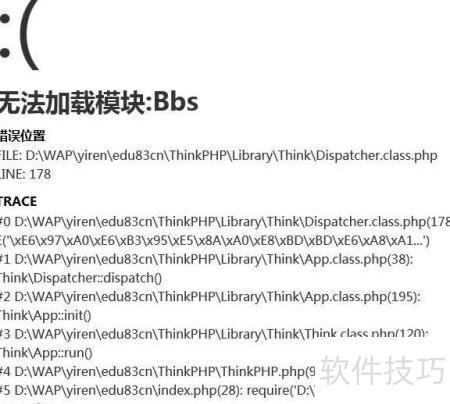 5、 调试时必须启用调试模式,即在入口文件中定义 define(APP_DEBUG, true),否则页面将显示空白,并提示Bbs模块(控制器)不存在,导致项目中断执行。随后,需在项目目录 Lib/Action 下新建一个名为 EmptyAction.class.php 的控制器类文件,用于处理未匹配到的模块请求,具体代码实现如下所示。此步骤对排查问题和确保路由正常至关重要。