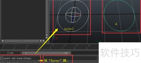 18、 在命令栏中输入脚本:parent -add -shape AShape,然后按下回车键确认执行操作。