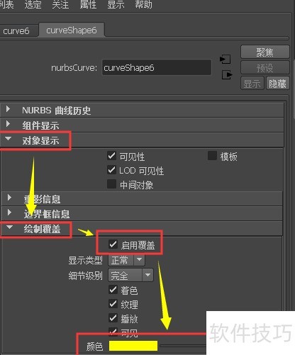 12、 打开属性编辑器,勾选绘制覆盖中的启用选项,调整曲线颜色。