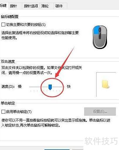 5、 进入鼠标属性,点击鼠标键选项,调节双击速度至合适位置。