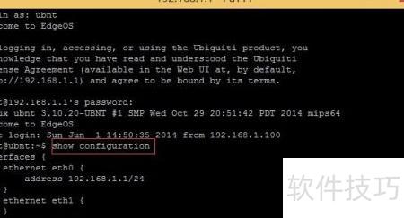 1、 通过PuTTY工具使用SSH连接EdgeRouter默认管理地址192.168.1.1,登录后进入系统配置界面,启用并设置Telnet服务,保存配置后即可通过Telnet方式进行设备访问与管理。