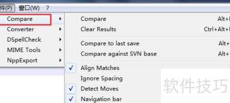 5、 重启Notepad++后,插件菜单中将显示Compare选项,即可正常使用对比功能。即使没有Plugins Manager,也不妨碍Compare功能的使用,操作依旧顺畅无阻。