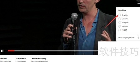 1、 打开TED视频后,若无字幕,可点击图示图标进行设置,加载字幕功能即可启用。