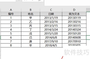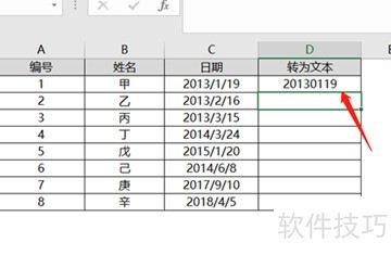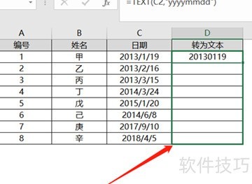 5、 将公式复制到D9区域末尾,松开鼠标即可批量转换日期为文本格式。