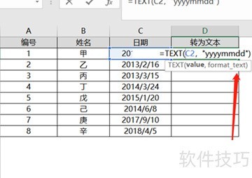 2、 在单元格输入=TEXT(C2,yyyymmdd),选择对应参数即可完成日期格式转换。