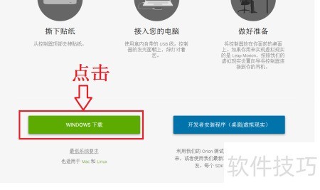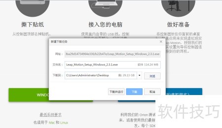 4、 点击后将弹出小窗口,提供Leap_Motion_Setup_Windows_2.3.1.exe驱动下载,直接点击下载。待文件下载完成后,运行安装程序完成驱动安装即可正常使用。