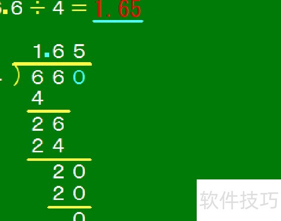 3、 被除数6.6为一位小数,除数为整数4。先按整数除法计算:6除以4商1余2,将余数与下一位6合并成26,26除以4商6余2,再借0变成20除以4得5,刚好除尽。商的小数点位置与被除数一致,因此结果为1.65。