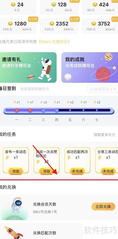 6、 进入页面,下滑至底部,点击即可查看可兑换的会员天数和匹配次数。