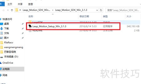 5、 下载完成后,打开所保存的程序包,在文件夹中定位到名为Leap Motion_Setup_Win_3.1.3的安装程序,该文件已被矩形框标出。双击此应用程序,即可启动安装流程。安装结束后,将Leap Motion设备连接至电脑,便可直接开始使用,操作简便,快速上手。