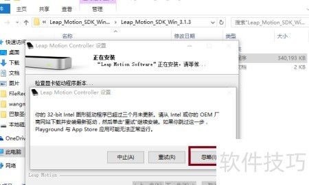 9、 安装Leap Motion_Setup_Win_3.1.3时,可能会弹出提示窗口,这通常与电脑显卡配置有关。若出现该提示,可直接点击忽略继续安装,不会影响后续Leap Motion的正常使用。高配置电脑尤其是具备高性能显卡的设备,一般不会遇到此类问题。为确保更流畅的操作体验,尤其是在结合VR应用时,建议使用显卡性能较强的计算机,以获得更稳定、灵敏的手势识别效果和整体运行表现。
