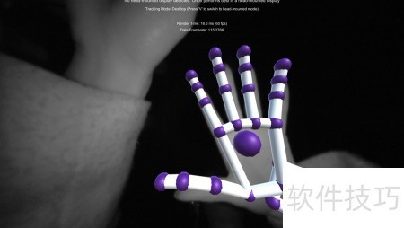 11、 开启观察器后,屏幕上会显示红外摄像头捕捉的实时画面,整个场景呈现灰白色调。当将手置于Leap Motion控制器上方时,画面中便会出现一只带有骨骼节点的机械手模型,它与灰白人手紧密关联,能精准跟随手势动作同步移动,实现虚实结合的交互效果。