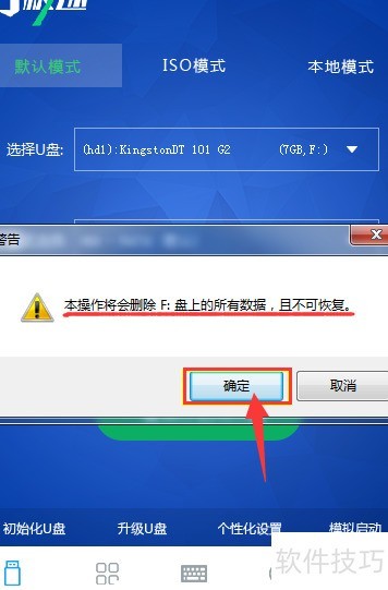 4、 制作过程中将清除U盘内所有数据,若已备份重要文件,请点击确定继续;若尚未备份,请选择取消,先将U盘中的数据妥善保存后再从第二步重新开始操作。