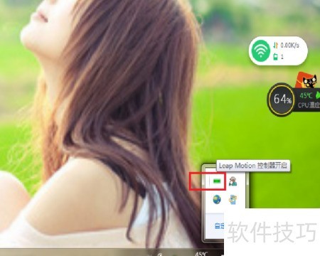6、 连接Leap Motion设备与电脑后,桌面会出现一个图标。若连接未成功,图标呈黑色;当连接建立后,图标变为绿色。中红色方框标注的位置所示,绿色图标表明设备已成功连接并可正常使用,用户可据此判断设备状态。
