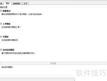 10、 点击设置后将弹出窗口,其中包含第二层菜单跟踪。在该菜单下可见手部跟踪与工具跟踪选项。勾选工具跟踪后,Leap Motion不仅能识别手部动作,还可同时对所持工具进行精准追踪,实现更全面的交互体验。