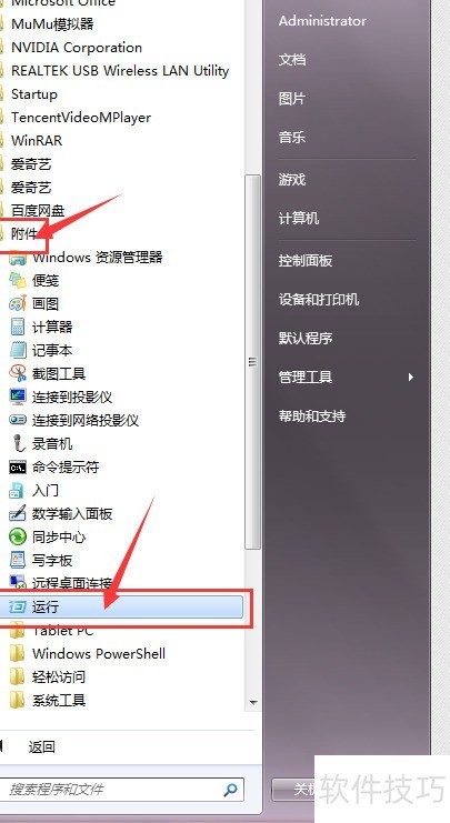 1、 首先启动电脑,点击开始菜单中的运行选项。
