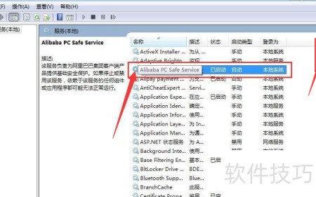 3、 进入服务主界面后,点击服务(本地)右侧名称栏的下拉箭头,滚动查找并选中Alibaba PC Safe Service服务项目。