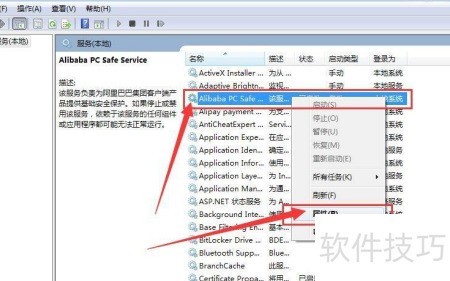 4、 接着,右键点击Alibaba PC Safe Service服务,在弹出的菜单中选择属性,进入该服务在本地计算机中的属性设置界面,以便进行后续配置与查看相关信息。