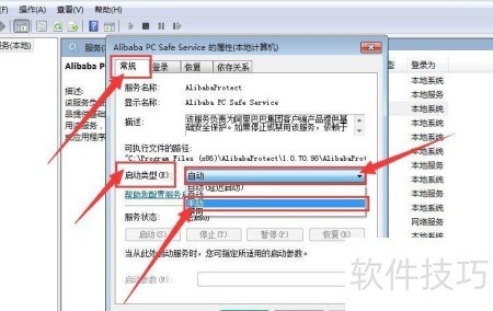 5、 进入Alibaba PC Safe Service服务属性界面后,点击顶部菜单栏的常规选项。在启动类型区域,点击右侧的下拉箭头,从弹出的菜单中选择所需的启动方式,如手动,完成设置即可。