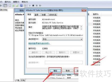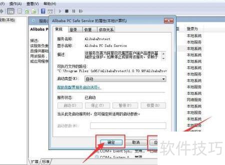 6、 此时,只需点击Alibaba PC Safe Service服务属性窗口下方的应用按钮,完成设置后,再点击确定即可保存配置。