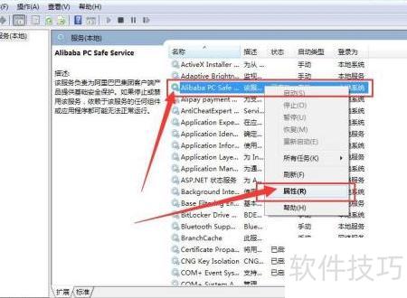 4、 此时,若需将Alibaba PC Safe Service服务设置为手动启动,可右键点击该项服务,在弹出的菜单中选择属性,进入该服务在本地计算机中的属性配置界面,随后即可对其启动类型进行相应调整,确保按实际需求设定运行方式,便于后续管理与操作。