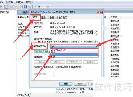 5、 在Alibaba PC Safe Service服务的属性界面中,进入选项卡,定位到启动类型设置项,点击其右侧的下拉箭头,从弹出的菜单列表中选择启动方式,完成配置后保存更改即可生效。