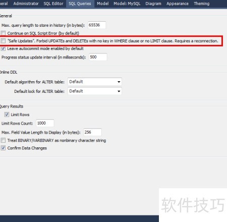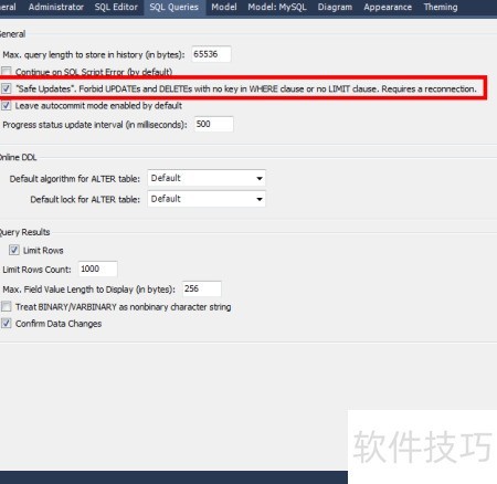 5、 在general选项卡中,安全更新功能目前处于启用状态。该设置旨在避免因操作失误造成整张表数据被修改,因此要求执行更新操作时必须包含有效的条件语句进行限制。