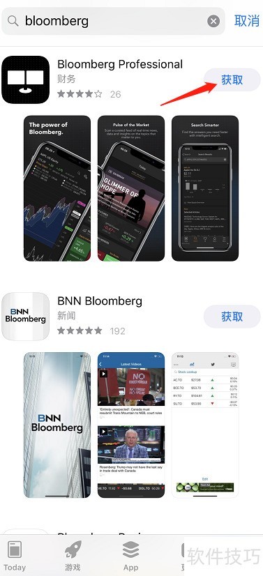 9、 在搜索框中输入Bloomberg Business进行搜索,找到该应用后点击右侧的获取按钮即可下载安装。