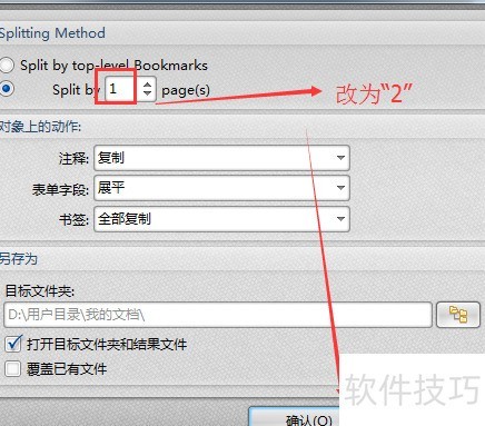 3、 将分割文件对话框第二行的数字1修改为2,然后点击确认按钮即可完成操作。