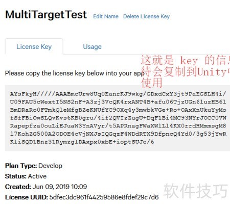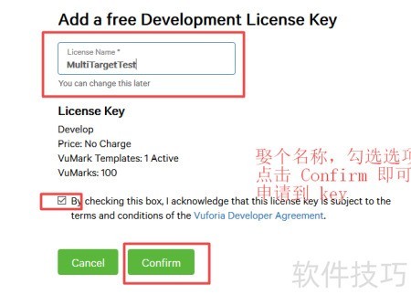 3、 登录Vuforia,获取密钥作为许可证使用,具体操作步骤所示。