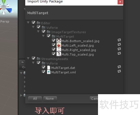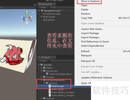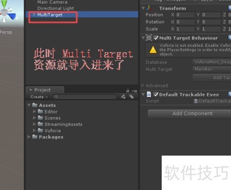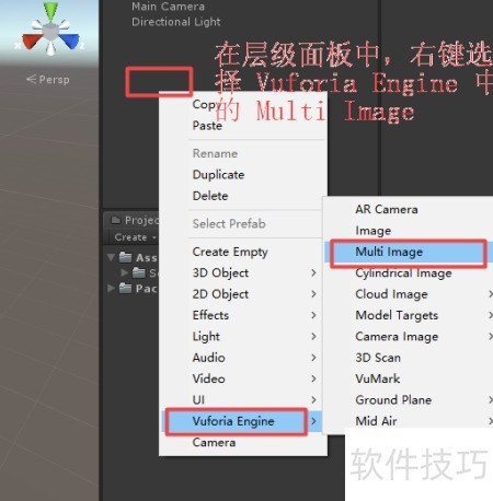 2、 启动Unity并创建空白项目,在层级视图中右键点击,从Vuforia Engine导入MultiTarget及相关资源,操作步骤所示。