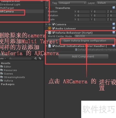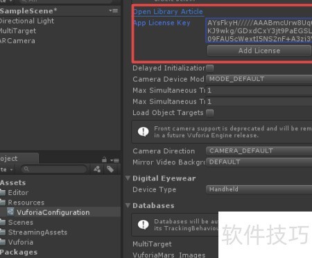 10、 在层级面板中移除原有的摄像机,右键选择添加Vuforia的ARCamera组件,随后将之前获取的App License Key复制粘贴到对应位置。若未填写授权密钥,功能将无法正常使用,具体操作可参考示意图。