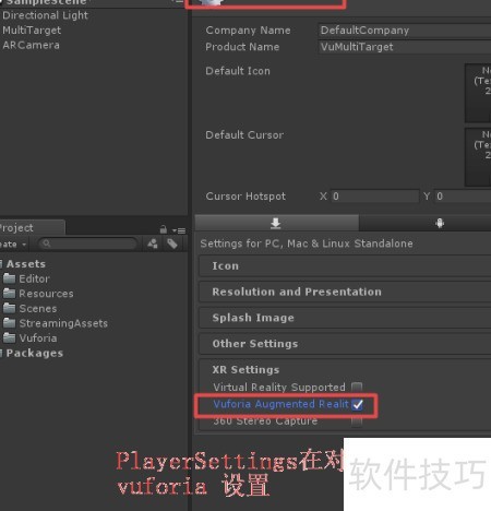 9、 在PlayerSettings中启用Vuforia所需平台支持,操作步骤所示。