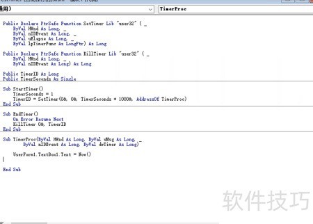 2、 声明函数SetTimer Lib user32,使用PtrSafe关键字,用于在64位系统中安全调用Windows API定时器功能,实现定时操作的设置与管理。