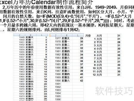 2、 万年历中年份通过数据有效性从J列选取,范围为1949至2049年,月份同样通过数据有效性从K列引用。判断每月天数时需结合IF函数进行逻辑判断:首先利用公式如=IF(MOD(E9,4)=0,闰月,平月)判定是否为闰年,进而区分二月为29天或28天;再通过嵌套IF函数确定各月具体天数,例如=IF(L52=大月,31,IF(L52=小月,30,IF(L52=闰月,29,IF(L52=平月,28,)))),以准确返回31、30、29或28天。设计日历布局时,考虑到单个月份最多跨越六周,共42天,因此L列按序号1到42排列,对应连续的日期位置;而K列则按星期日、星期一……星期六的顺序循环排列,形成完整的每周七天结构,确保日历显示符合实际周序规律,实现清晰、准确的日期展示效果。
