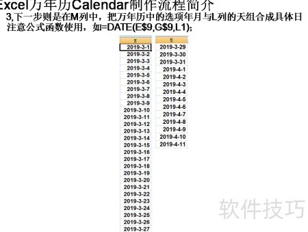 3、 在M列中,将万年历的年月与L列的天合并为完整日期,需正确使用公式函数,例如输入=DATE(E\$9,G\$9,L1)实现自动计算。