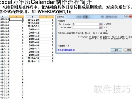 4、 在N列中,将M列的日期转换为对应的星期数值,使用公式=WEEKDAY(M1,1),注意函数参数设置,确保返回结果符合星期对应规则。