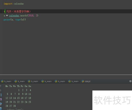 2、 通过calendar.month(2018, 2)获取2018年2月的日历,结果为字符串类型并输出内容及数据类型。