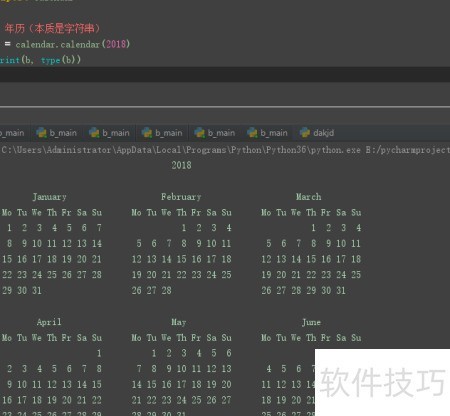 4、 2018年的日历以字符串形式输出,通过calendar.calendar函数生成,打印结果同时显示其数据类型为字符串。