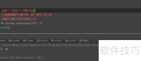 10、 返回一个包含两个元素的元组,第一个元素表示该月第一天是星期几(即首周缺失的天数),第二个元素表示指定月份的总天数。例如,调用calendar.monthrange(2018, 2)将输出2018年2月的相关信息。