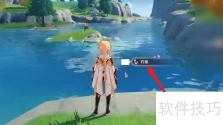 1、 进入原神手游,前往河边点击开始钓鱼。