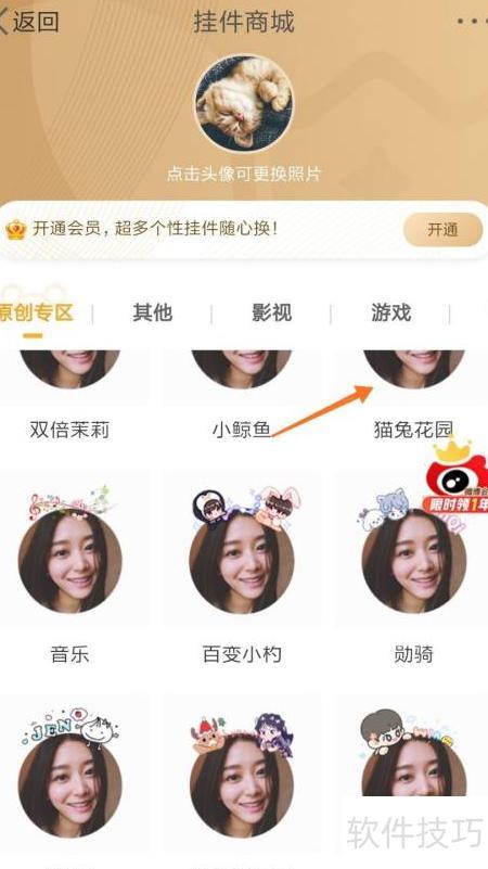 3、 进入头像挂件页面,选择猫兔花园即可浏览相关内容。