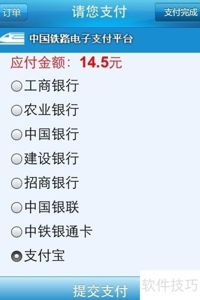 4、 手机购票客户端支持多家银行、银联、中铁银通卡及支付宝付款,涵盖工、农、中、建四大行,支付方式多样,操作便捷,提升了购票体验。