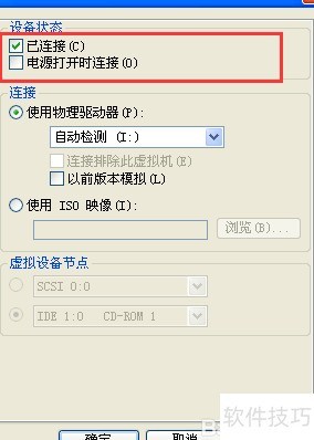 10、 为实现虚拟机与主机同时读取光盘,可依次选择虚拟机软件菜单中的虚拟机→可移动设备→CD ROM1(IDE 1:0)→编辑,打开CD-ROM设备设置窗口。在设备状态区域勾选电源打开时连接和已连接选项,确认无误后点击确定按钮,保存设置并关闭对话框。此操作可确保虚拟机启动时自动连接光驱设备,方便光盘内容的读取与使用。