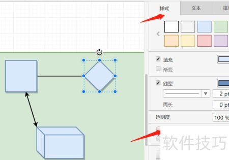 4、 双击流程图中的图形或连线可添加内容,点击图形后右侧将显示工具栏,支持调整背景颜色、间距、透明度及字体样式等设置。