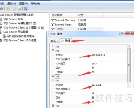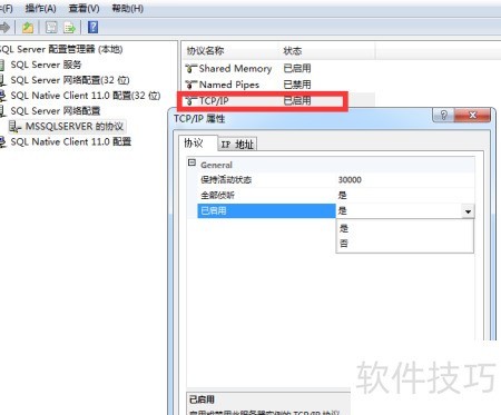 2、 打开SQL Server 配置管理器,进入SQL Server 网络配置中的MSSQLSERVER 的协议,启用TCP/IP协议。随后在IP 地址选项卡中,将对应 IP 地址设置为启用状态。用户可根据实际网络环境选择合适的 IP 地址进行开启,通常情况下使用系统安装后默认分配的 IP 即可满足需求,无需额外更改。
