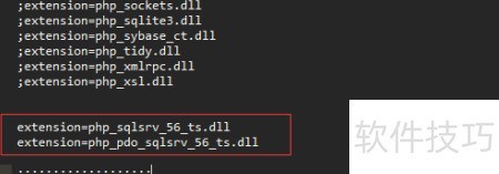 6、 将php_pdo_sqlsrv_56_ts.dll和php_sqlsrv_56_ts.dll两个驱动文件复制到PHP安装目录的ext子目录中,然后打开php.ini配置文件,在文件末尾添加两行扩展加载指令,启用SQL Server驱动支持,保存并重启Web服务以使更改生效。