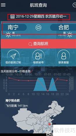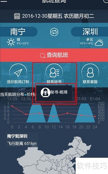 4、 返回机票查询页面,选择国内航班,填写出行日期、出发地和目的地后,点击联系秘书。所选航班信息将自动发送给秘书,由秘书一键完成订票操作,方便快捷。